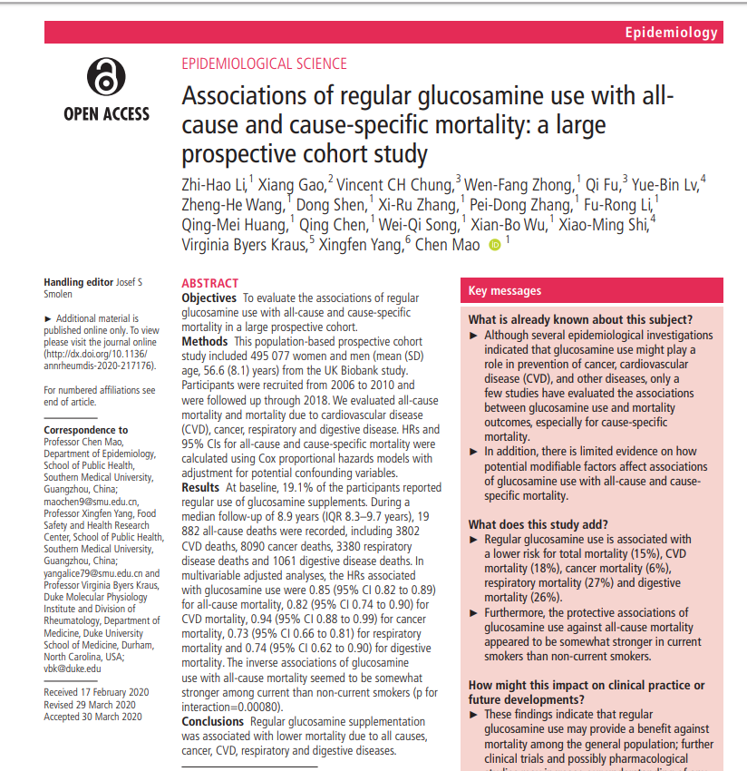 图 经常服用葡萄糖胺与全因死亡和死因别死亡风险关系的研究在线发表于Annals of The Rheumatic Diseases
