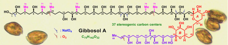 迄今,从海洋甲藻中共报道了50余个超级碳链化合物,其中仅Amphidinol 3,Karlotoxin2和Ostreol B三个分子的绝对立体化学得以完全确立,它们分别含有25、28和24个碳手性中心。吴军团队经过数年的努力,首次揭示了海洋超级碳链化合物的新类型。Gibbosols A和B均含有37个碳手性中心,是本世纪以来绝对立体化学得以完全确立的分子量最大的超级碳链化合物。两个超级碳链化合物在结构上差异微小,但是活性却完全相反。Gibbosol A能够显著地促进细菌脂多糖诱导的人脐静脉内皮细胞的血管细胞黏附分子-1的表达;反之,Gibbosol B却显著地抑制血管细胞黏附分子-1的表达,可作为新型抗动脉粥样硬化活性化合物进行深入研究。