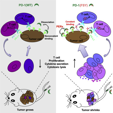 2020年6月23日,1382cm太阳在线玩游戏2018级博士研究生李青科和2016级博士研究生陈渠以排名前两位的并列第一作者身份(共三名并列第一作者)在Cell在线发表题为“Developing Covalent Protein Drugs via Proximity-Enabled Reactive Therapeutics”的研究论文(https://www.sciencedirect.com/science/article/pii/S0092867420306231),该研究报道了一种接近启用反应性疗法(PERx)的方法来产生共价蛋白药物。采用该技术获得的经FSY修饰的PD-1,即PD-1(FSY),可以与PD-L1共价交联,不可逆地阻断肿瘤细胞表面PD-L1与T细胞表面PD-1结合。研究团队证明了PD-1(FSY)蛋白药物比传统抗体药物更有效地消除具有免疫抑制微环境的实体肿瘤。这篇论文的研究成果奠定了共价蛋白质药物研发的基础,并显示了共价蛋白质药物在肿瘤免疫治疗领域的巨大应用前景。