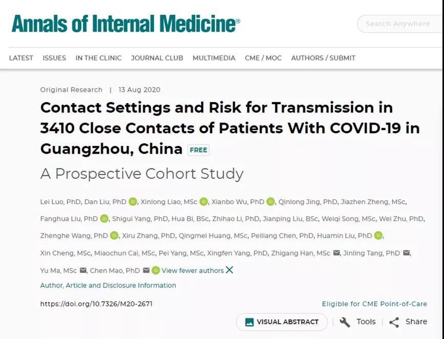 广州市3410名COVID-19密切接触者的接触方式和传播风险的研究在线发表于Annals of Internal Medicine