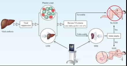 图示.Baveno VI标准联合脾脏硬度(≤46 kPa)的顺序算法可排除病毒学抑制的HBV相关肝硬化患者的高风险静脉曲张