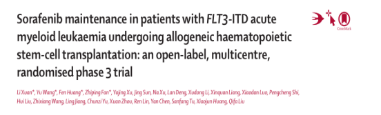 由研究生导师南方医院血液科教授刘启发牵头并作为独立通讯作者,南方医院血液科宣丽、北京大学血液病研究所王昱、南方医院血液科黄芬、范志平作为共同第一作者完成的“FLT3-ITD阳性AML患者移植后应用索拉非尼预防白血病复发的有效性和安全性的3期随机对照研究”, 于8月10日在国际权威学术期刊《柳叶刀·肿瘤》(The Lancet Oncology)在线发表(IF=33.752)。