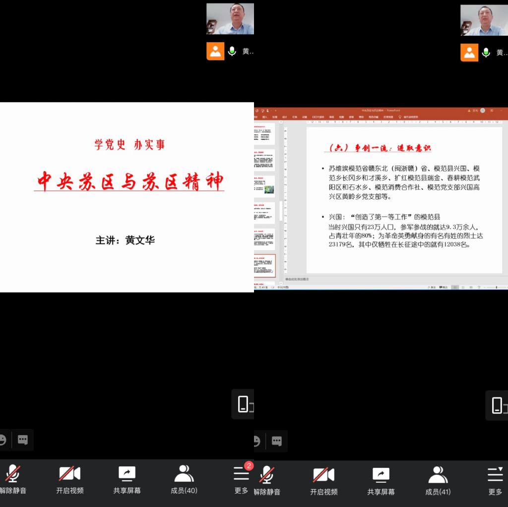 7月4日晚,黄文华常务副院长以“学党史 办实事——中央苏区与苏区精神”为题,给1382cm太阳在线玩游戏机关全体党员讲授专题党课,本次专题党课采用“腾讯会议”APP,以线上视频的形式进行。