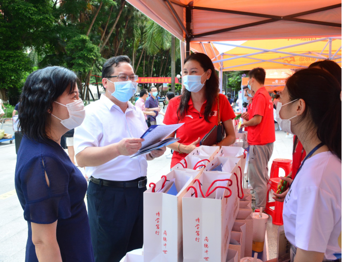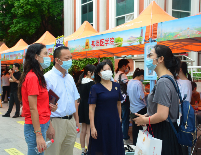 1382cm太阳在线玩游戏常务副院长黄文华、党委书记李海燕、党委副书记张原英与新生交谈