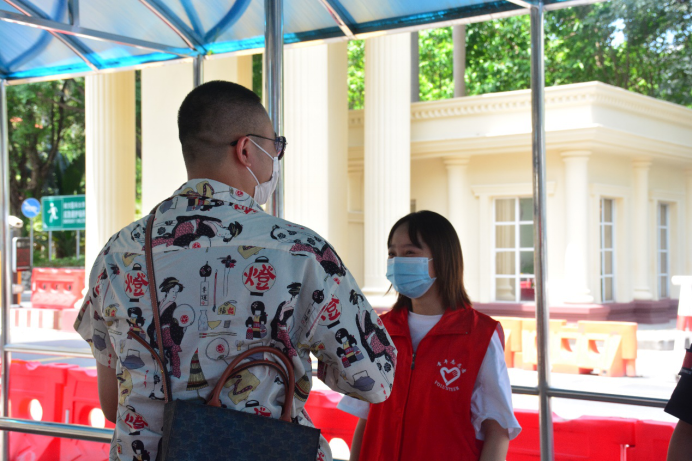 学校东门,前来报到的研究生经过体温检查、健康码查验、身份核实等陆续进入学校,在教学区1号门前完成复测体温、复核信息后,顺利来到图书馆前的报到现场。