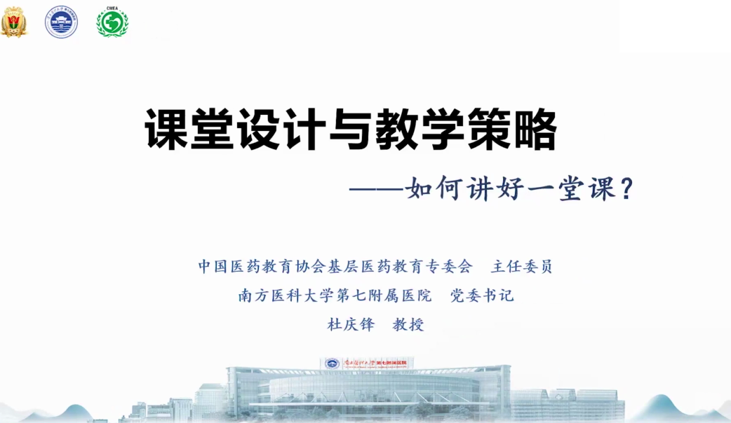 1382cm太阳在线玩游戏第七附属医院党委书记杜庆锋以《课堂设计与教学策略——如何讲好一堂课》为题,从课程设计与教学的背景概念、一个中心目标、两个关键手段、三个内容模块、四个教学要素、五个注意事项等方面详细介绍了如何讲好一堂课。