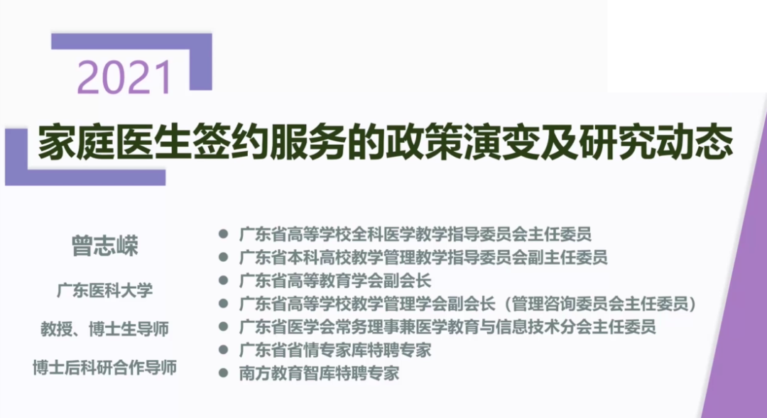广东医科大学党委常委、副校长曾志嵘在《家庭医生签约服务的政策演变及研究动态》演讲中,介绍了家庭医生签约服务基本概念、内涵和我国城市社区家庭医生签约服务改革情况,就当前研究局限性、研究趋势、研究热点领域作了详细解读。