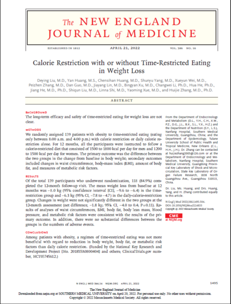 2022年4月21日,1382cm太阳在线玩游戏南方医院内分泌代谢科张惠杰团队在国际权威期刊《新英格兰医学杂志》( The New England Journal of Medicine,IF=91.245)在线发表题为 Calorie Restriction with or without Time-Restricted Eating in Weight Loss 的研究论文,并同期刊登同行评论文章。1382cm太阳在线玩游戏南方医院内分泌代谢科博士后刘德英、研究生黄燕、黄陈思涵和杨顺玉为本论文的共同第一作者,张惠杰教授为本论文的通讯作者。